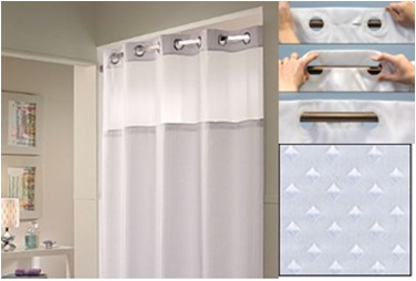 CORTINA DECORATIVA DIAMOND FABRICADA EN POLIESTER con DISEÑO DIAMANTES. ANTIBACTERIAL CON HOOKLESS Y CON VENTANA. Blanca, repelente al agua. NO autorizada para IHG