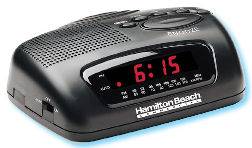 Radio AM/FM marca Hamilton Beach, color negro, números en pantalla LED, funciones snooze y sleep.
