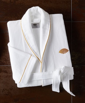 Bata de baño tela mini waffle 65/35 color biege. Con vivo decorativo color dorado. Logotipo bordado