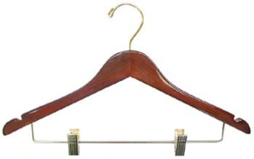 Gancho Hotelero Madera de Pino color CAOBA con barniz. Perno NORMAL. Caja con 100 pzas. Con Pinzas