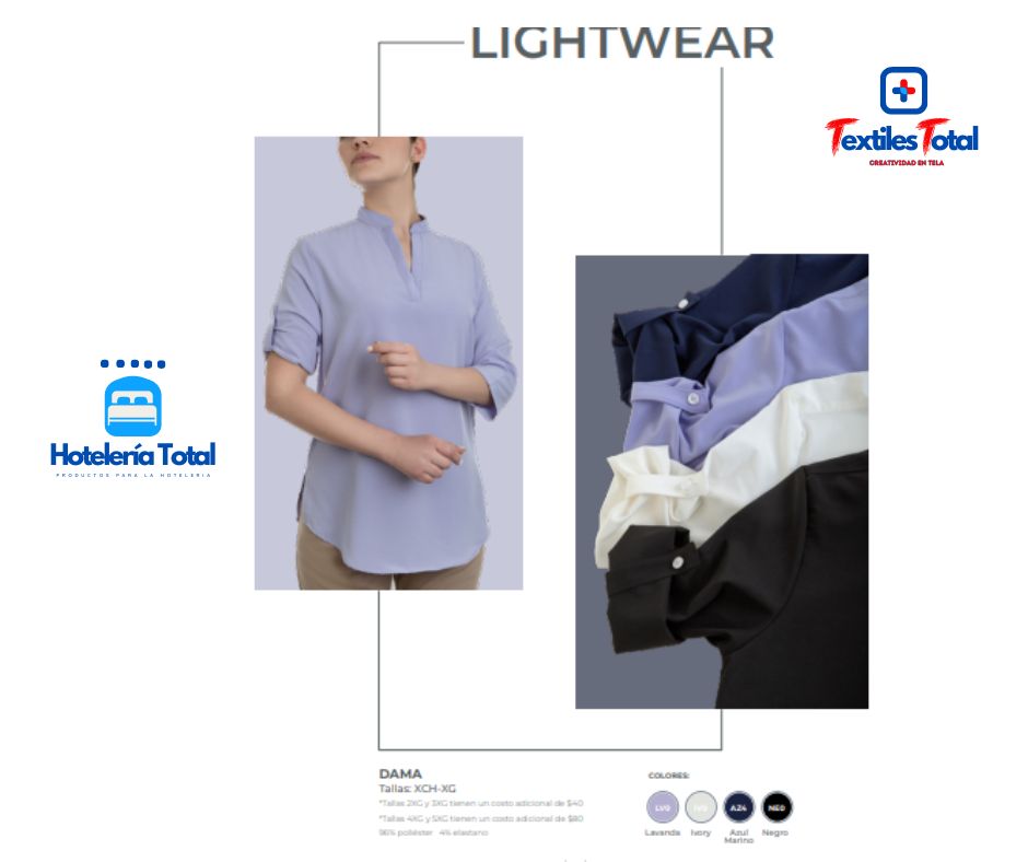 DAMA *Tallas 2XG y 3XG tienen un costo adicional de $40 *Tallas 4XG y 5XG tienen un costo adicional de $80 96% poliéster 4% elastano COLORES: IV0 L