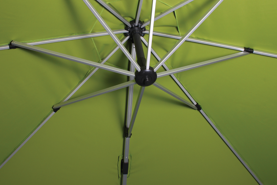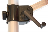 Ajuste de altura y pedal para giro de 360 grados que beneficia ante el movimiento del sol. Manivela para abrir y cerrar toldo