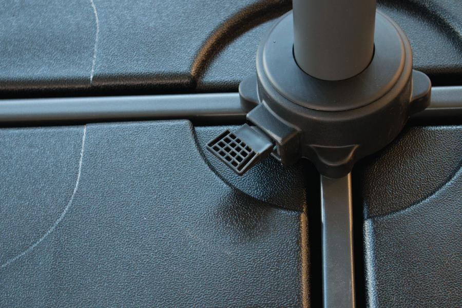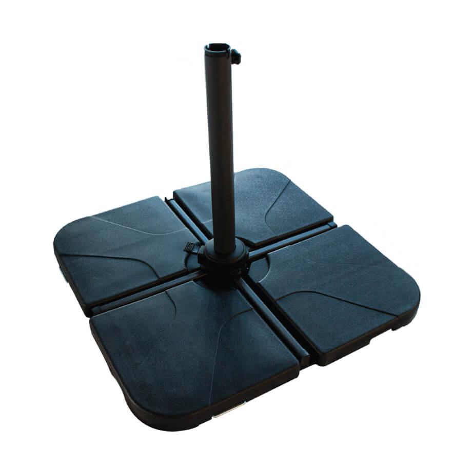 Pedestal metálico (1x1mts) en forma de cruceta, con 4 bases negras (50x50cm) de plástico rellenables. Peso máximo de cada base: 18 kg