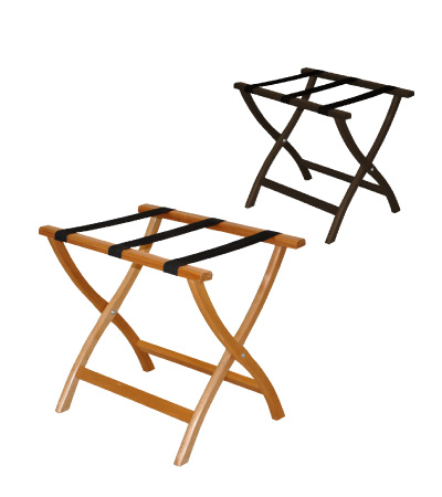 Tijera porta maleta curva fabricada en madera bannak terminado con barniz transparente con cintas de polipropileno color negro.