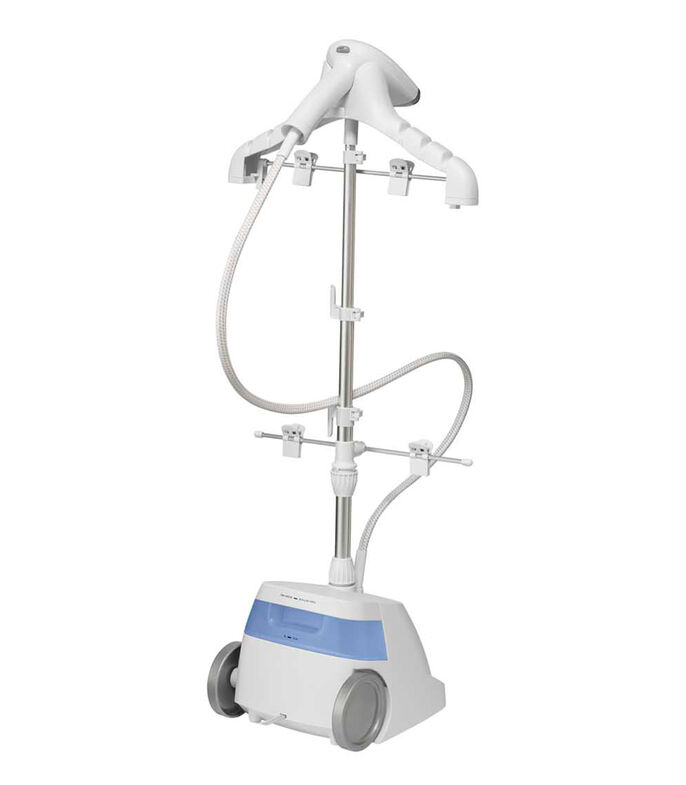 Percha Valet: La innovadora pecha para varias prendas tiene 6 ranuras para poner a la ropa en hilera y lograr que el proceso de vaporización sea más eficiente. La percha también tiene 4 ganchos y gira 360° en un barral telescópico para facilitar el alisado a cualquier altura y ángulo. Dos ganchos para enrollar el cable y un soporte para el vaporizador hacen que la unidad esté ordenada y sea compacta para facilitar su almacenamiento.