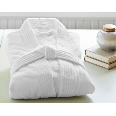 85% poliéster, 15% nylonBata de sensación agradablemente suaveColor blancoDoble presilla para dama y caballeroUnisexProducto de importación