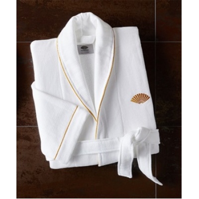 Bata de baño tela mini waffle 65/35 color biege. Con vivo decorativo color dorado. Logotipo bordadoUnitallaXLXXL