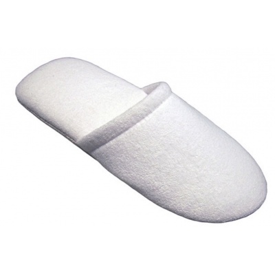Pantufla para huesped Felpa 100% Algodón color blanca. Punta Cerrada Suela Suave Con logotipo ESTAMPADO Personalizado. Caja con 100 pares.Talla